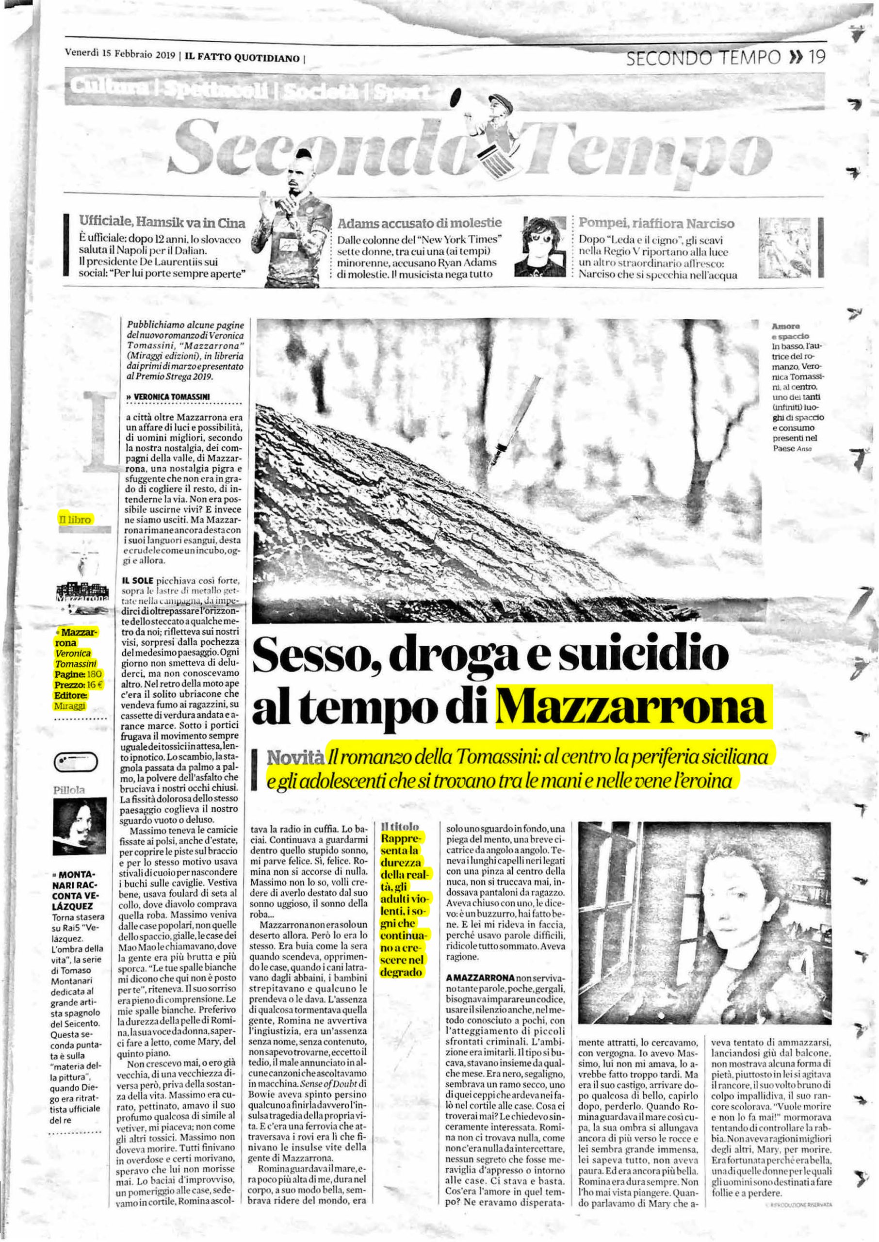 Mazzarrona, così, è macelleria verbale, l’epica dei disadatti, l’epos dei tossici che come spettri s’abbarbicano uno sull’altro, stipati, nel rione dantesco della “Mazzarruna”, ai confini di Siracusa. Una geologia di gente resa bestiale dalla dipendenza e dal dolore, calcificata nell’oblio, nella città che ospitò Eschilo e Platone, cantata da Pindaro, detta duramente da Tucidide. “Dovevo bruciare Mazzarrona, le steppe, il fango, l’infamia di quel deserto morale… Una giovinetta snaturata della sua salvifica vanità. Non mi bucavo. Non ero malata di Aids. Era solo la morte degli altri, che avanzava implacabile e lenta, ad avermi contagiato”. Di fronte alle storie di muto strazio raccontate dalla Tomassini, con una abbacinante indipendenza stilistica (“Sono fatta per superare i graticci, saltarli, oltrepassare i valli. La buona battaglia. Mi dico: è stata la tua buona battaglia. Sì, ma per dove? O perché? Lasciate che io mi chieda: perché? Oggi mi siedo sotto la finestra, non sono una ragazza, e con la mano, come allora, tengo il mento. Guardo lo stesso cielo, violaceo, verso sera, gli storni, e il mio colore di capelli è ancora bruno come allora”), gli abbandoni della Gamberale hanno fragranza comica. Con altra potenza rispetto ai “libertini” di Tondelli, come una santa nel rebus dei lebbrosi, la Tomassini impone la grazia tra i perdenti, perché la catacomba della periferia è prova e martirio. Mazzarrona è tra i libri che sono stati scelti per concorrere al prossimo Premio Strega: se capitasse a questo romanzo, se varcasse lo stigma della cinquina, ne sarei felice, potrei pure dire che c’è speranza, allora, per la letteratura italiana autentica, che dal basso qualcosa di verticale, simile all’alba, sfugga al controllo.