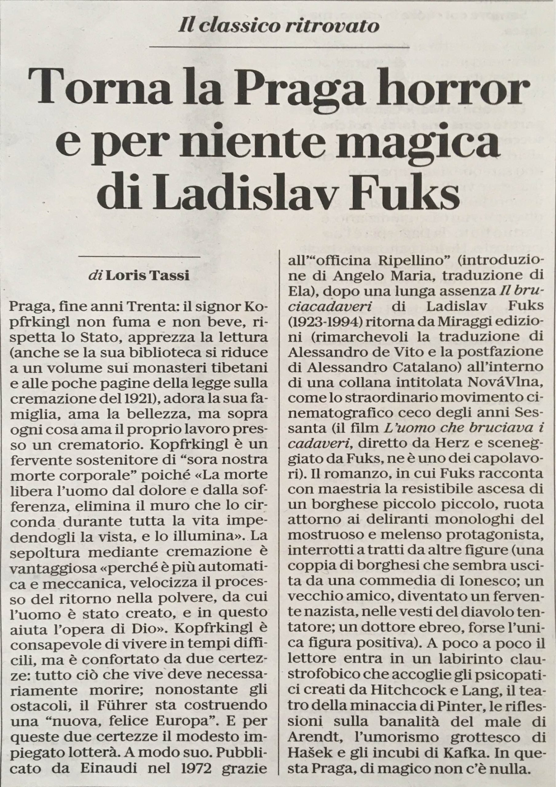 Pubblicato da Einaudi nel 1972 grazie all’officina Ripellino (introduzione di Angelo Maria, traduzione di Ela), dopo una lunga assenza Il bruciacadaveri di Ladislav Fuks (1923-1994) ritorna da Miraggi edizioni (rimarchevoli la traduzione di Alessandro de Vito e la postfazione di Alessandro Catalano) all’interno di una collana intitolata NováVlna, come lo straordinario movimento cinematografico ceco degli anni Sessanta (il film L’uomo che bruciava i cadaveri, diretto da Herz e sceneggiata da Fuks, ne è uno dei capolavori). Il romanzo, in cui Fuks racconta con maestria la resistibile ascesa di un borghese piccolo piccolo, ruota attorno ai deliranti monologhi del mostruoso e melenso protagonista, interrotti a tratti da altre figure (una coppia di borghesi che sembra uscita da una commedia di Ionesco; un vecchio amico, diventato un fervente nazista, nelle vesti del diavolo tentatore; un dottore ebreo, forse l’unica figura positiva). A poco a poco il lettore entra in un labirinto claustrofobico che accoglie gli psicopatici creati da Hitchcock e Lang, il teatro della minaccia di Pinter, le riflessioni sulla banalità del male di Arendt, l’umorismo grottesco di Hasek e gli incubi di Kafka. In questa Praga, di magico non c’è nulla.