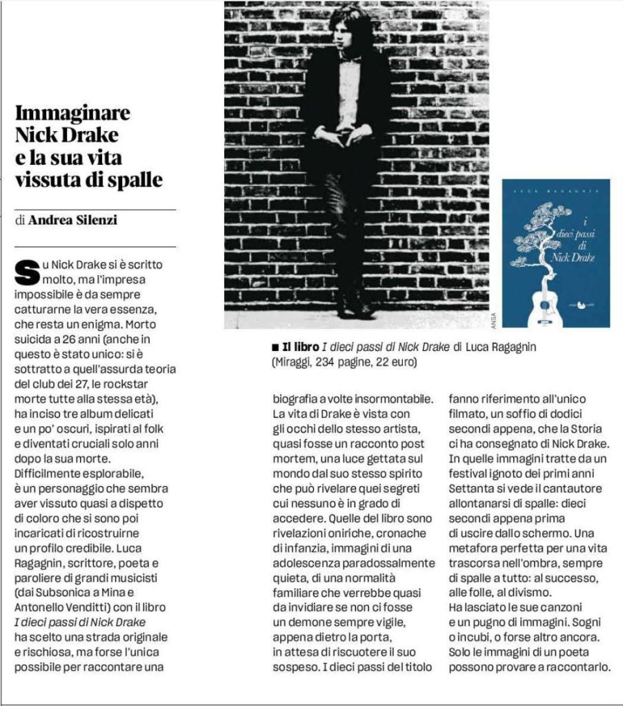 Su Nick Drake si è scritto molto, ma l’impresa impossibile è da sempre catturarne la vera essenza, che resta un enigma. Morto suicida a 26 anni (anche in questo è stato unico: si è sottratto a quell’assurda teoria del club dei 27, le rockstar morte tutte alla stessa eta), ha inciso tre album delicati e un po’ oscuri, ispirati al folk e diventati cruciali solo anni dopo la sua morte. Difficilmente esplorabile, è un personaggio che sembra aver vissuto quasi a dispetto di coloro che si sono poi incaricati di ricostruirne un profilo credibile. Luca Ragagnin, scrittore, poeta e paroliere di grandi musicisti (dai Subsonica a Mina e Antonello Venditti) con il libro I dieci passi di Nick Drake ha scelto una strada originale e rischiosa, ma forse l’unica possibile per raccontare una dieci passi di Nick Drake biografia a volte insormontabile. La vita di Drake è vista con gli occhi dello stesso artista, quasi fosse un racconto post mortem, una luce gettata sul mondo dal suo stesso spirito che può rivelare quei segreti cui nessuno è in grado di accedere. Quelle del libro sono rivelazioni oniriche, cronache di infanzia, immagini di una adolescenza paradossalmente quieta, di una normalità familiare che verrebbe quasi da invidiare se non ci fosse un demone sempre vigile, appena dietro la porta, in attesa di riscuotere il suo sospeso. I dieci passi del titolo fanno riferimento all’unico filmato, un soffio di dodici secondi appena, che la Storia ci ha consegnato di Nick Drake.