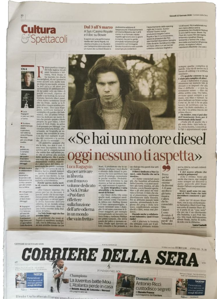 Figura poetica e tragica del folk inglese tra gli anni Sessanta e Settanta, Nick Drake ci ha lasciato tre dischi meravigliosi, di cui i posteri si sono accorti solo molto tempo dopo la sua morte, avvenuta nel 1974 a 26 anni per un’overdose di antidepressivi. Di lui esiste solo un video di pochi secondi, ripreso di spalle a un festival, in cui si allontana facendo dieci passi. «Non siamo nemmeno sicuri che sia Drake, anche se la figura alta e magra sembra proprio la sua», dice Luca Ragagnin, scrittore torinese e «complice di parole» dei Subsonica, che all’artista britannico ha dedicato un nuovo libro che prende spunto e titolo proprio da quel video, I dieci passi di Nick Drake, in arrivo il 28 gennaio per Miraggi. Una creatura letteraria ibrida, affascinante, né biografia né romanzo, ma entrambe le cose. Con due voci narranti: la prima del cantante e la seconda … di chi è la seconda?